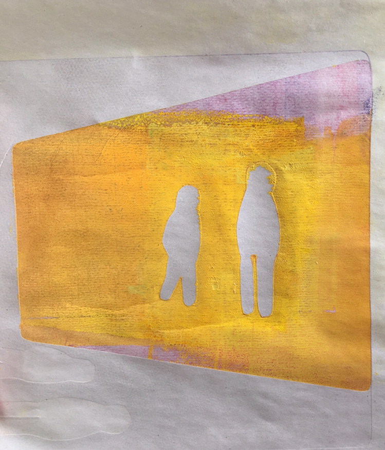 Homebound, monotype, drypoint and stamps, 10 x 10 in, 2019